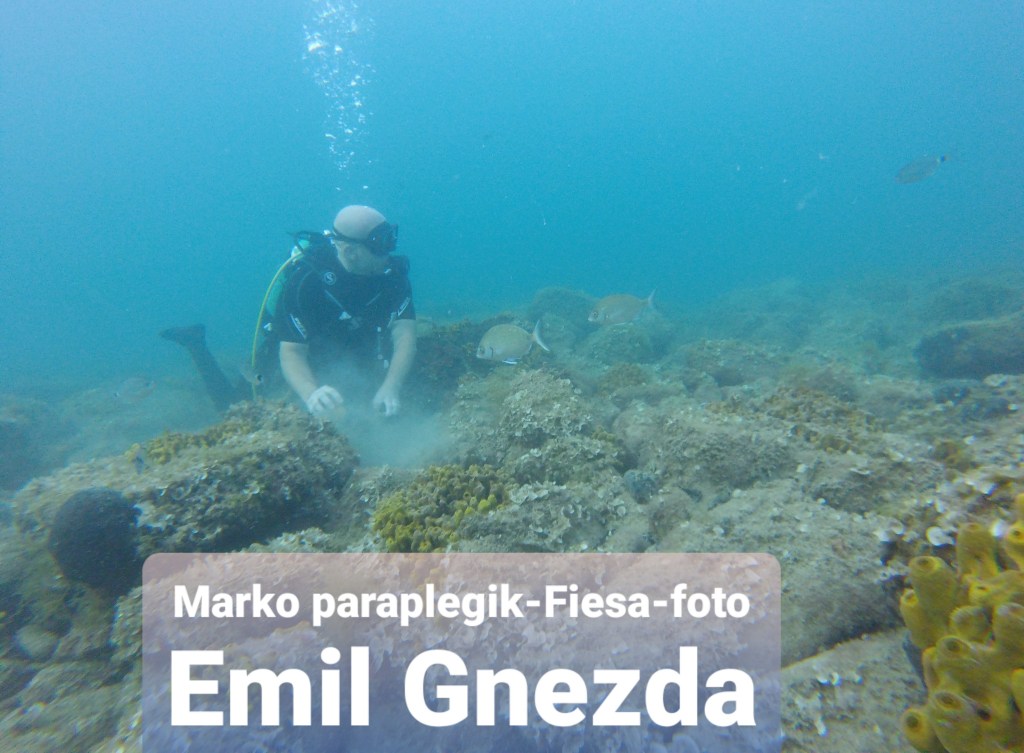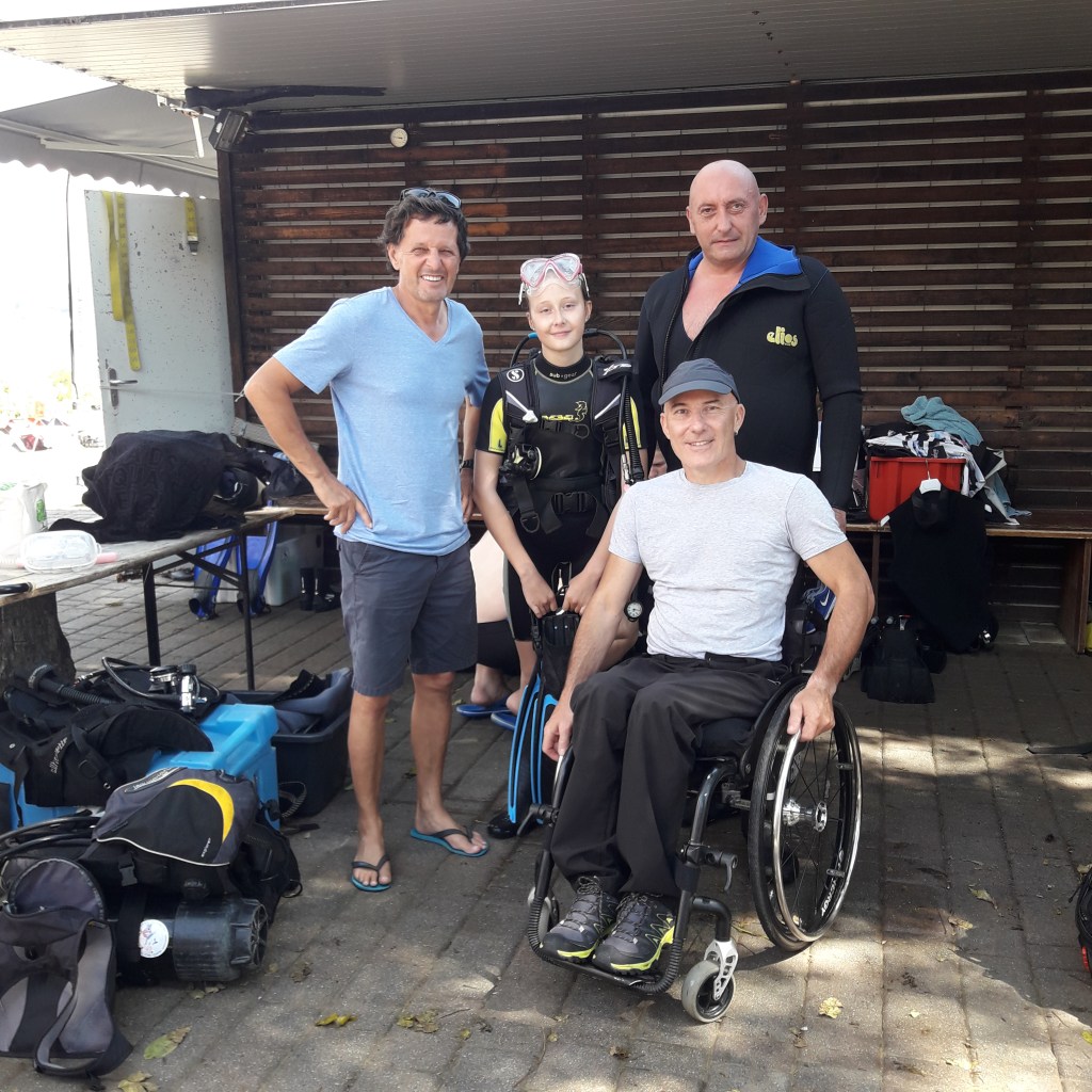 Damjan Peklar – paraplegik , pred leti pričel s prvimi potopi v Fiesi, sedaj podaja svoje znanje in izkušnje ostalim, na fotografiji njegova hči v potapljaški opremi….